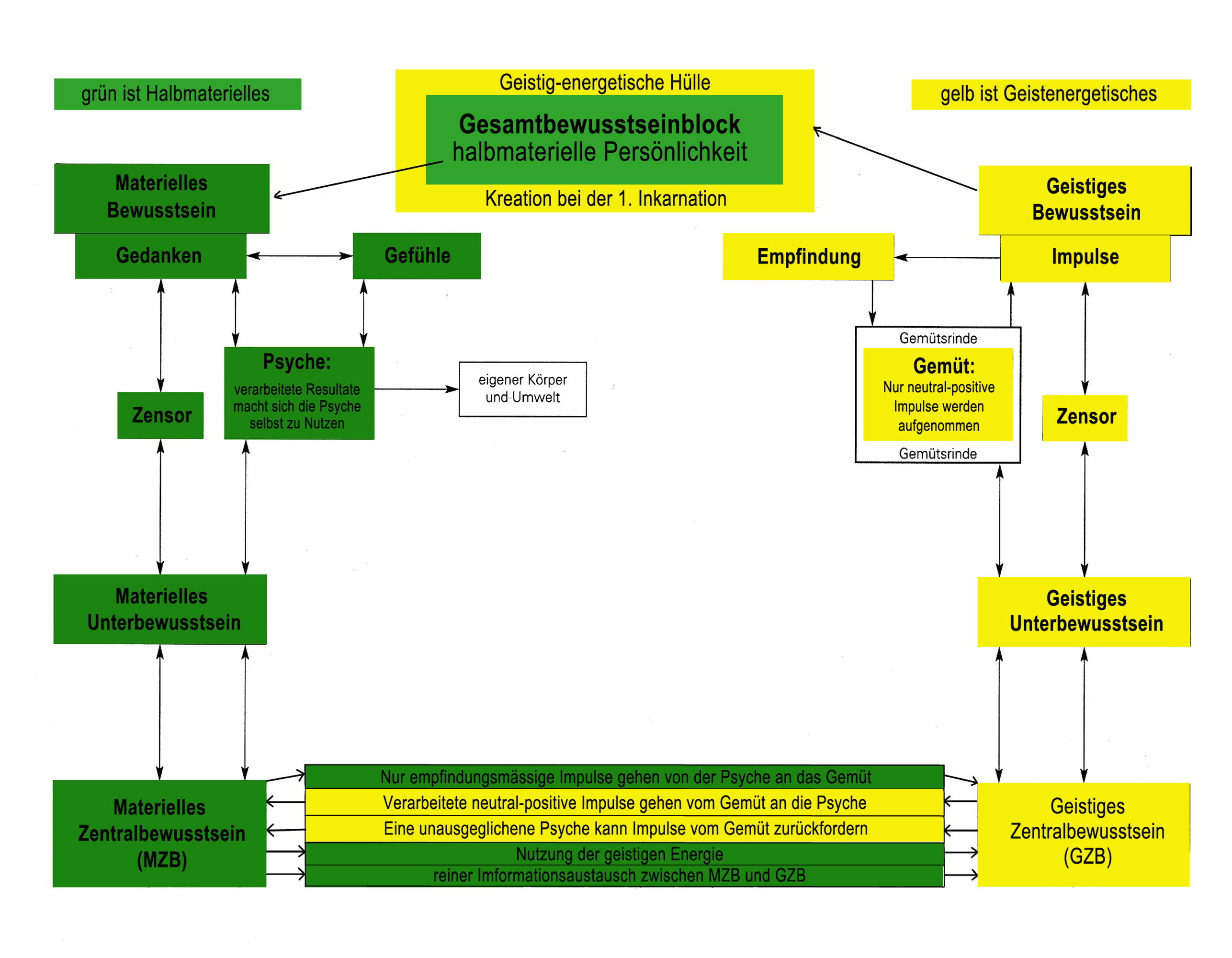 An der Skizze ist gut ersichtlich, dass das Gemüt ein rein geistiger Faktor ist und somit dem Geistkörper, also dem Innersten zugehörig ist, während die Psyche dem materiellen Körper eingeordnet ist.