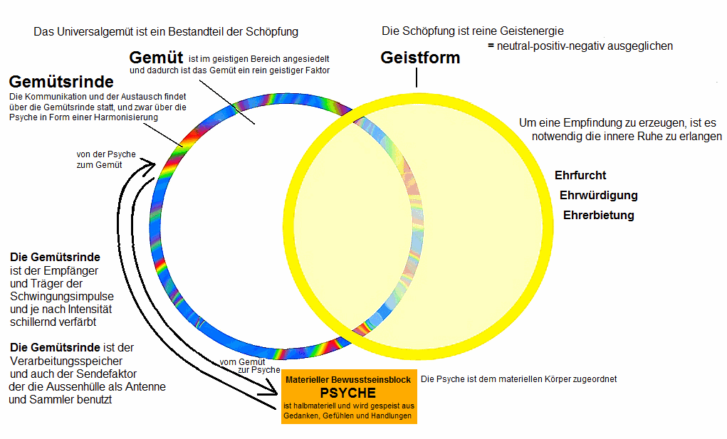 Das Gemüt ist eine schöpferische allbewusstseinsmässige Kraft, die sowohl als schöpferischer Universalblock, als auch in unzählbaren Formen, als winzigste, jotahafte Gemütsformen in zahllosen Lebensformen existiert, die in dieser Form eine unzerstörbare Einheit bilden, wie dies auch mit der Schöpfungsgeistform und den zahllosen Teilstückchen Schöpfungsgeist der Fall ist, die allerlei Gattungen und Lebensformen beleben; denn das Gemüt ist im schöpferischen beinhaltet und ist das Empfindungsleben der Schöpfung.