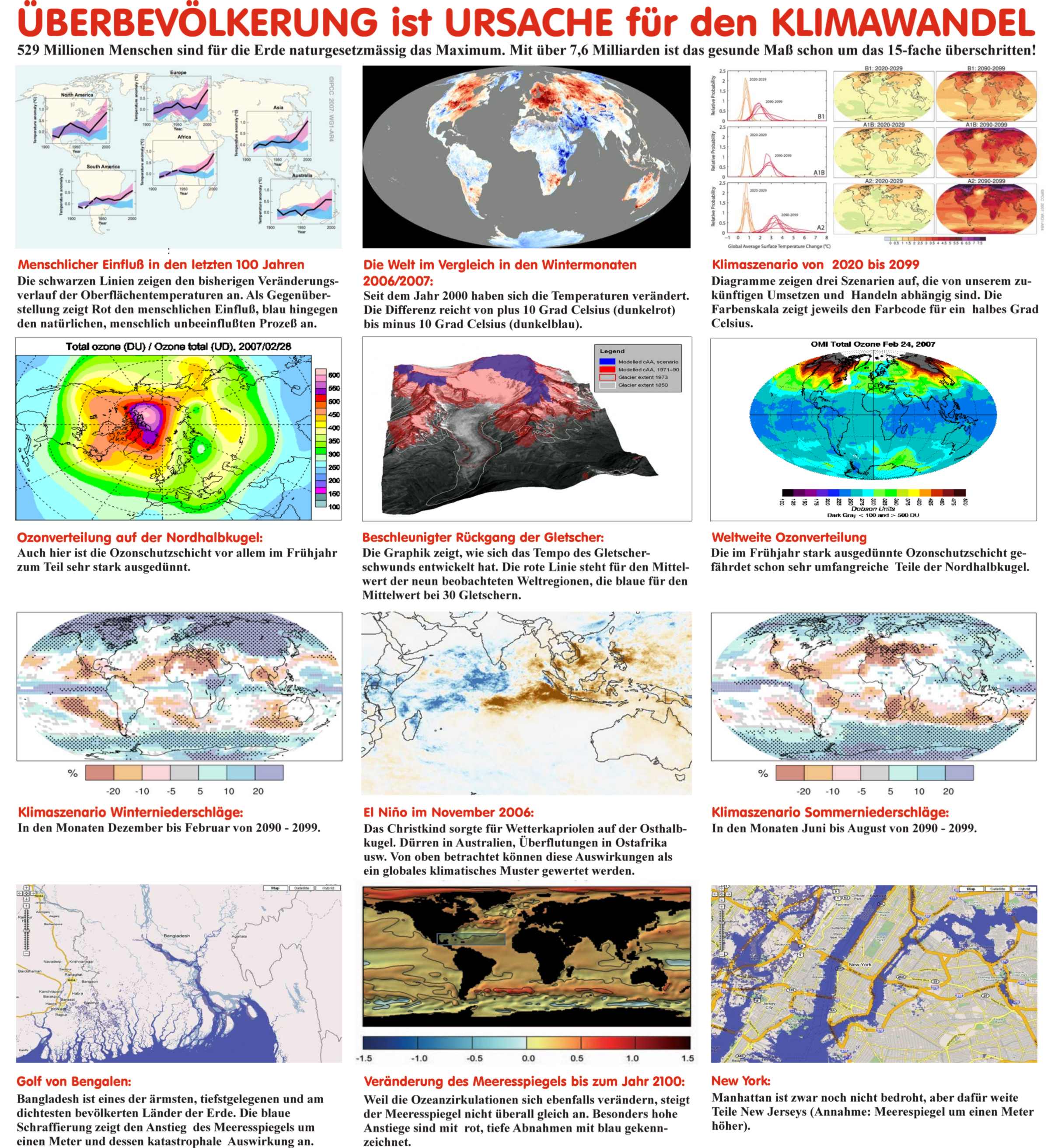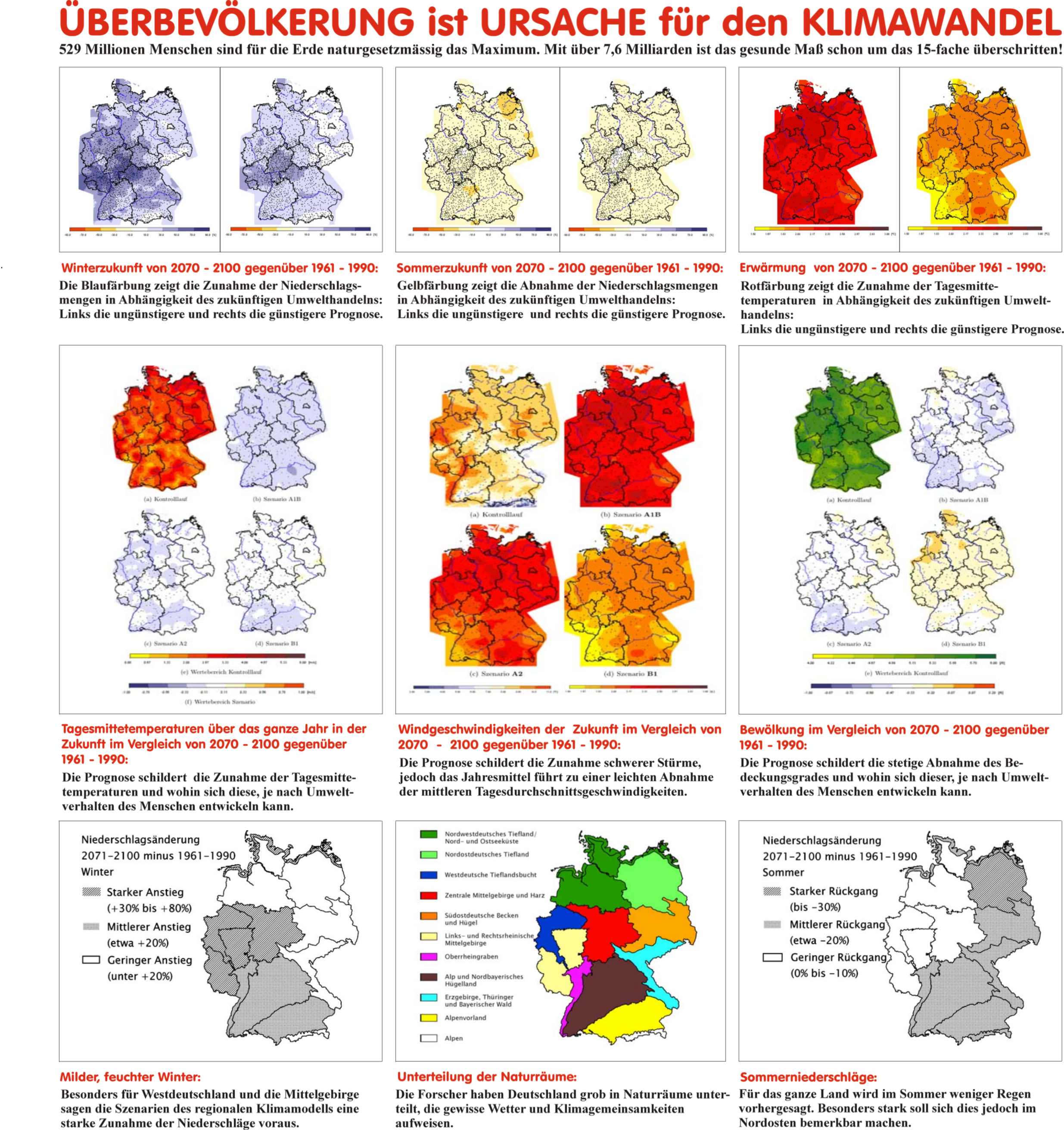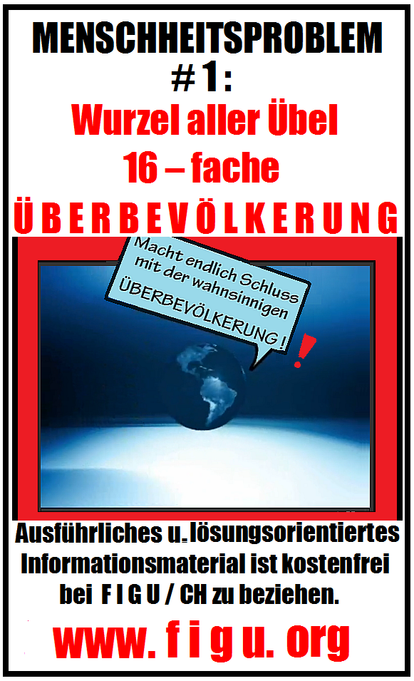 Das Thema Überbevölkerung wird meist weltweit verschwiegen oder ist nur selten als Problematik klar im Bewusstsein der Menschen verankert. Und das obwohl die Erdbevölkerung seit dem Bestehen dieser Problematik durch Informations-Technologien global vernetzt ist und auch wirtschaftlich voneinander lebt. Die Anzahl der Menschen auf der Erde am 31.12.2011 beträgt 8.199.430.908 und weicht zum besagten Datum um mehr als 1 Milliarde von den offiziellen Schätzungen nach oben ab. Diese Erdbevölkerungszahl stammt von JHWH Ptaah von Erra/Plejaren und wurde im Jahre 2012 dargereicht. Nähme man die von erfahrenen und ausserirdischen Lebensformen gegebene Grundlage für nachhaltiges, langfristiges und harmonisches Leben mit der Natur, welches mit ca. genau 12 Menschen pro Quadratkilometer fruchtbarem Land gewährleistet wäre, so überschreiten wir mit obiger Bevölkerungszahl diese Weisung auf der Erde um mehr als das fünfzehnfache. Zu dem Thema Überbevölkerung auf der Erde stellen wir mehrere Artikel zur Verfügung, die die grundlegenden Zusammenhänge aufklären. Die Überbevölkerung wird darin als erste Ursache und Wurzel aller menschgemachter Übel auf der Erde ausgemacht. Als Gegenmassnahme kann nur eine weltweit geregelte Geburtenkontrolle mit Geburtenstopp dienen, bis ein erträgliches Mass an Bevölkerungszahl wieder erreicht wurde. Vom Lehrer der Neuzeit «Billy» Eduard Albert Meier (BEAM) wurde schon in den 50er Jahren des letzten Jahrhunderts auf diese Problematik in einem Brief hingewiesen: Warnung an alle Regierenden Europas (pdf-Datei) . Auf unseren Internetzseiten erklären auch die Mitglieder der FIGU Studiengruppe Süddeutschland die Verbindung zwischen Überbevölkerung und anwachsenden Umwelt- und Sozialproblemen, welche sich unmittelbar auf die persönliche Lebensqualität eines jeden einzelnen auswirken: Artikel Überbevölkerung. Hierin werden auch die konkreten, erforderlichen Massnahmen wie eine weltweite Geburtenkontrolle und ein Geburtenstopp erklärt, die eine Reduzierung der Erdbevölkerungszahl auf ein erträgliches Mass ermöglichen. Denn eine ausgeglichene Menschenzahl auf einem Planeten steht mit einer hohen Wertschätzung jedes einzelnen Menschenlebens im Einklang, da eine ausgeglichene Menschenzahl pro Lebensraum die persönliche Evolution, Entwicklungsvoraussetzungen im geistigen, bewusstseinsmässigen und materiellem Rahmen erst ermöglicht. Geburtenkontrolle steht nicht im Zusammenhang mit einer Geringschätzung menschlichen Lebens, da durch eine Geburtenkontrolle in einem überbevölkerten Rahmen neues Leben vor der Entstehung verhindert wird und bestehendes Leben nicht zerstört wird. Bei Erreichen einer gesunden Bevölkerungsdichte hat neues Leben und bestehendes Leben wieder schöpferisch-natürliche Lebens- und Entwicklungsvoraussetzungen. Unsere Überbevölkerungsplakate, welche von der FSS gestaltet wurden, zeigen den Zusammenhang zwischen Überbevölkerung graphisch oder kombiniert mit wissenschaftlichen Studien und Vorausberechnungen: