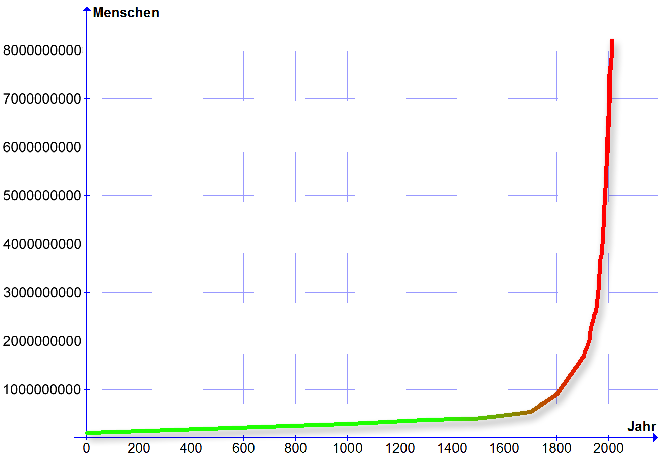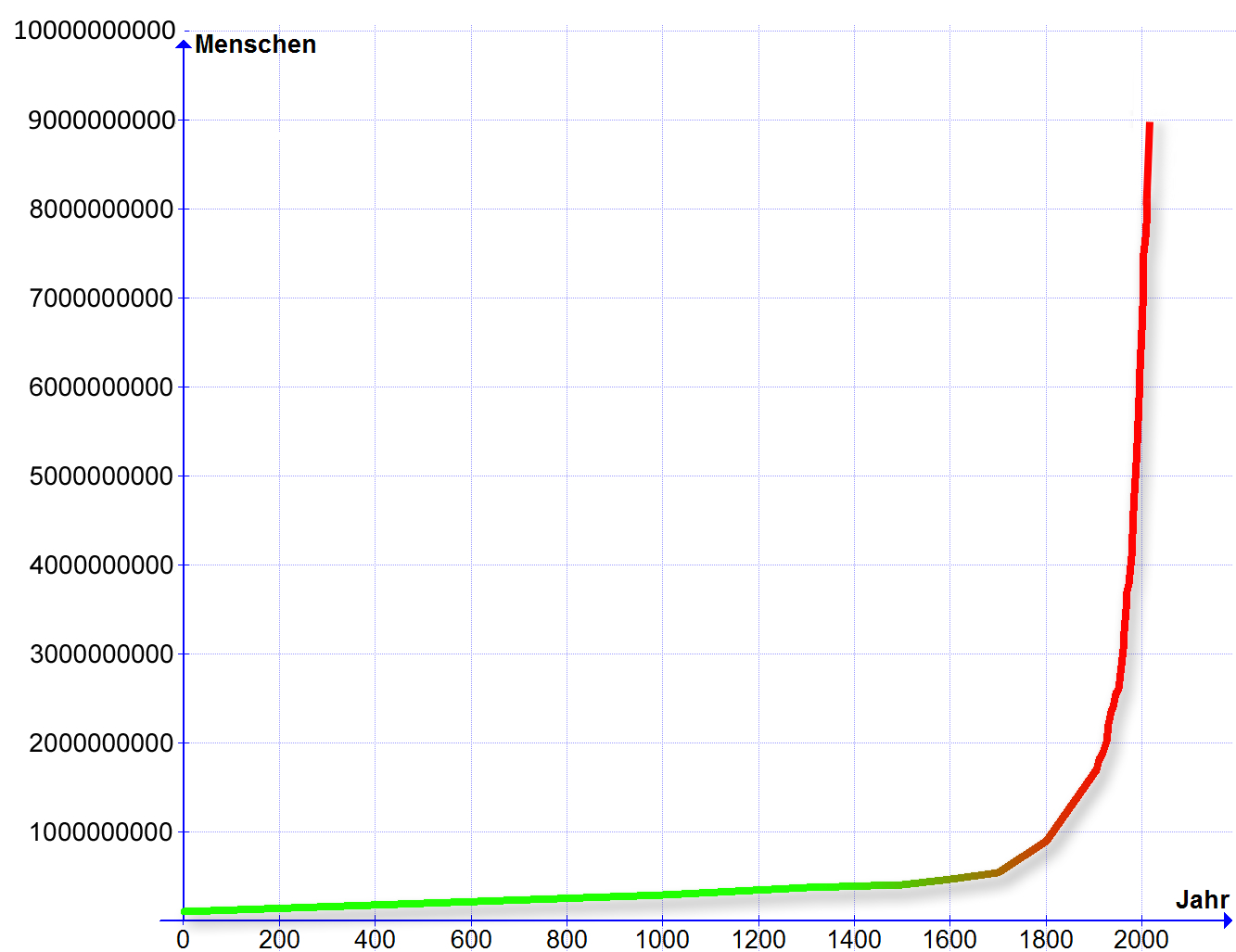 Graphische Darstellung der realen und wahren Zunahme der Erdbevölkerung mit logaritmischer Zeitachse: